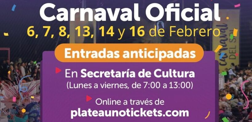 El Carnaval Oficial se desarrollará los días 6, 7, 8, 13, 14 y 16 de febrero, y para estas jornadas ya se encuentran a la venta las entradas anticipadas, con un valor de $5.000 la entrada general.
