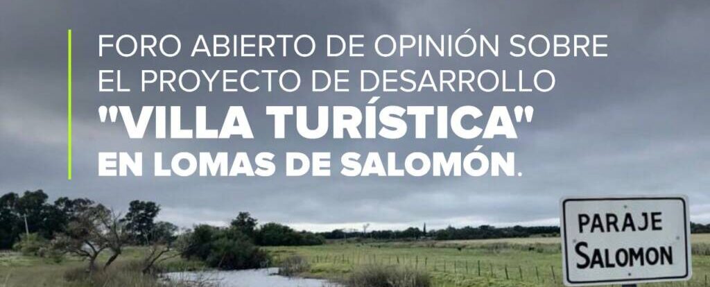 Convocatoria por el Proyecto “Villa Turística” en Lomas de Salomón Publicado por Municipalidad de Dolores - 25 marzo, 2022 El Intendente Camilo Etchevarren, invita el lunes 28 de marzo al Foro Abierto de Opinión sobre el Proyecto de Desarrollo “Villa Turística” en Lomas de Salomón, que se llevará a cabo de 14.30 a 15.30 horas, en el Salón Blanco Municipal.