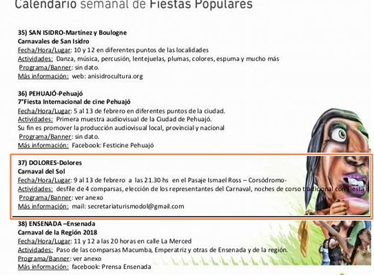 En esta oportunidad se difunde en la agenda oficial de la Subsecretaría de Turismo de la Provincia de Buenos Aires, el Carnaval del Sol de nuestra ciudad, logrando así la difusión por redes sociales provinciales y nacionales.
