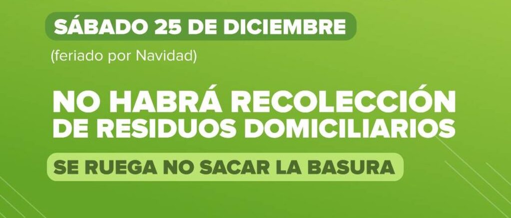 El 25 no se recolectan residuos Publicado por Municipalidad de Dolores - 20 diciembre, 2021 Desde la Secretaría de Obras Públicas de la Municipalidad de Dolores se comunica que el sábado 25 de diciembre no habrá recolección domiciliaria de residuos.