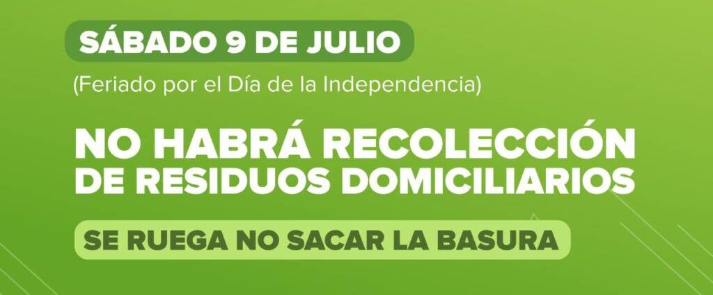 Desde la Secretaría de Obras y Servicios Públicos de la Municipalidad de Dolores, se informa que el sábado 9 de Julio por el Día de la Independencia, no habrá recolección domiciliaria de residuos.