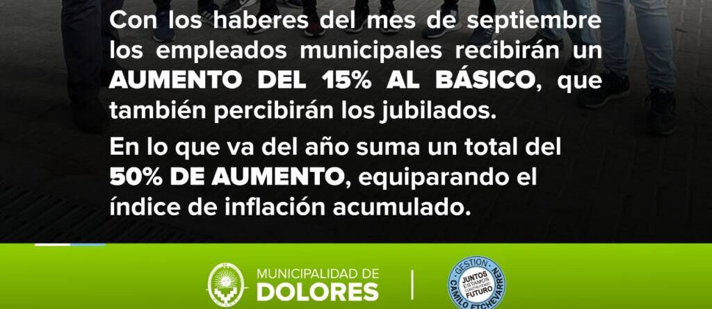 El Intendente Camilo Etchevarren, anunció que los trabajadores municipales percibirán con el sueldo del mes septiembre un aumento del 15 % al básico, que también será percibido por los jubilados.