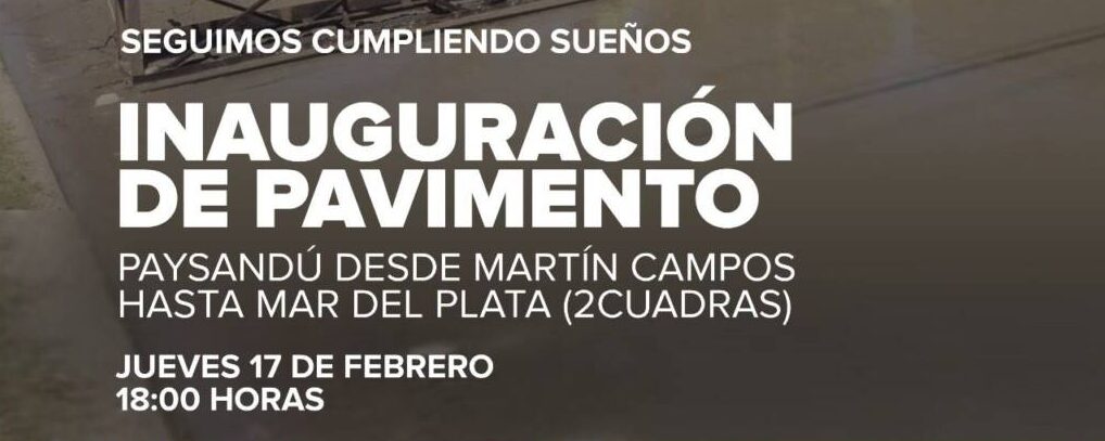 El jueves 17 de febrero, a las 18.00 horas, el Intendente Camilo Etchevarren, inaugurará dos cuadras de pavimento en calle Paysandú entre Martín Campos y Mar del Plata.