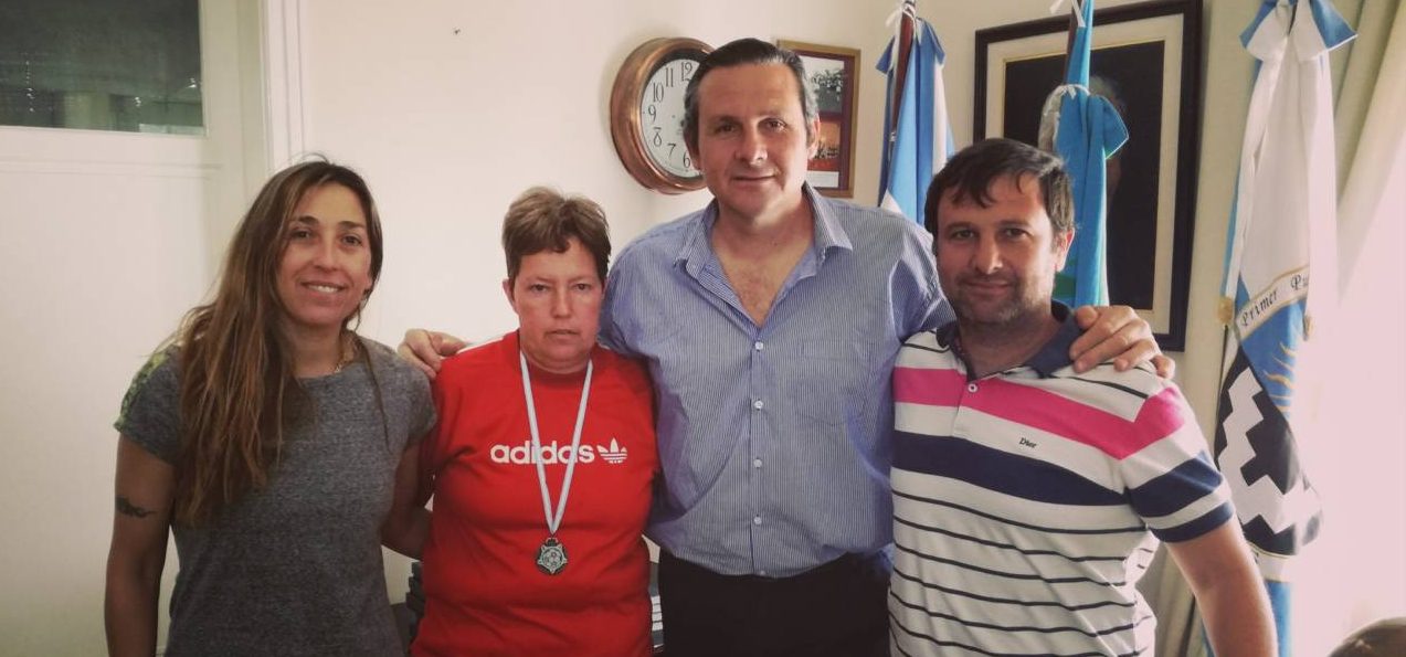 El Intendente Camilo Etchevarren, hizo entrega de una medalla a Adriana Pardo, por su trabajo en el Torneo de Fútbol 7 Municipal, que se realizó el domingo pasado en el Polideportivo. Lo acompañaban el Secretario y la Directora de Deportes, Gastón Garófalo y Cristina Andrada.