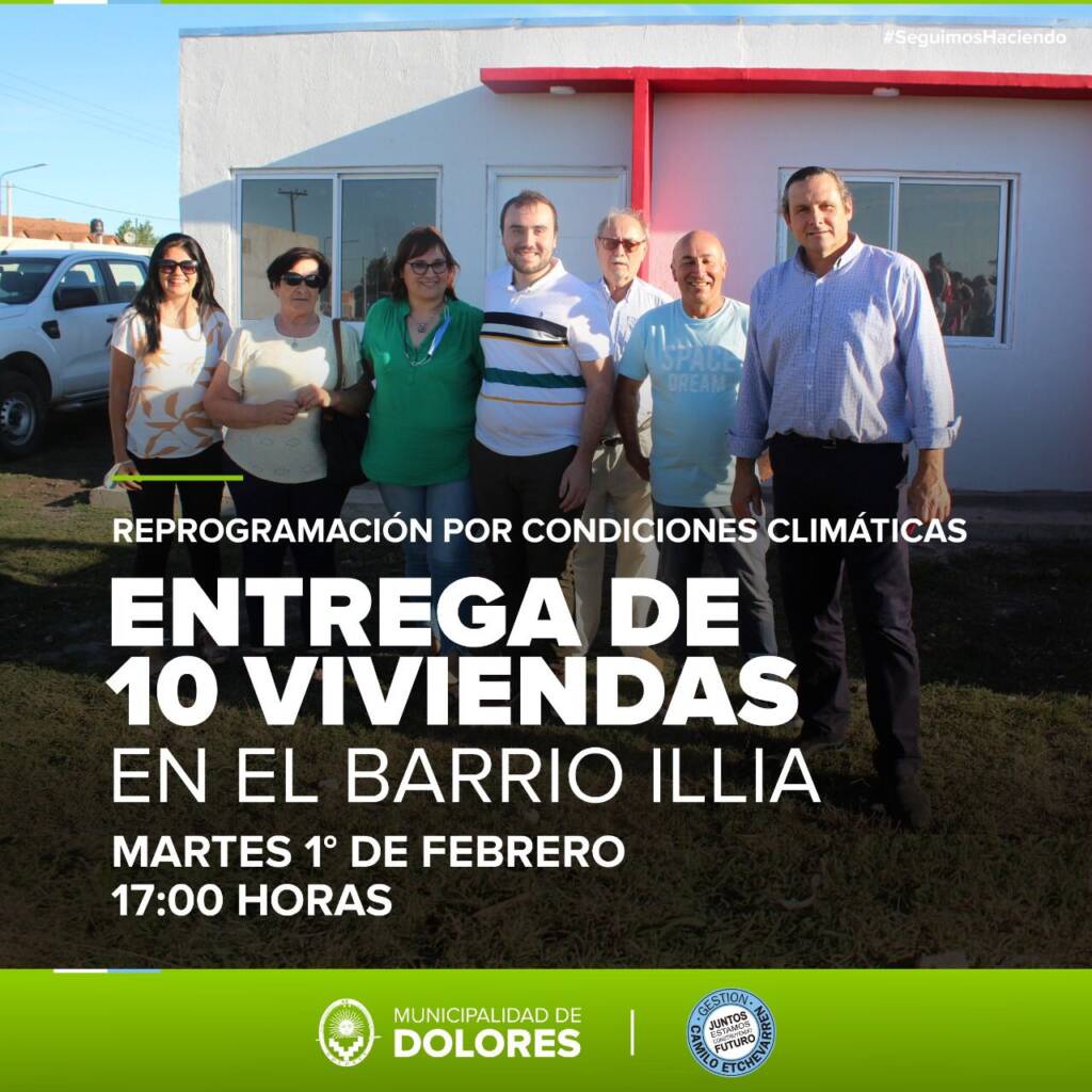 El Intendente Camilo Etchevarren, informó que se reprogramó la entrega de viviendas que se iba a llevar el próximo jueves. “Debido a las malas condiciones climáticas de los últimos días tuvimos que reprogramar para el martes 1º de febrero la entrega de las casas de Barrio Arturo Illia, serán diez las que se entregarán desde las 17.00 horas”, señaló el Jefe Comunal.