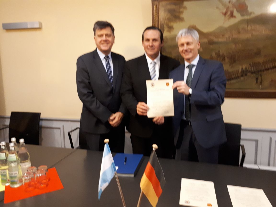 El Intendente Camilo Etchevarren, viajó expresamente a la ciudad alemana para rubricar el documento junto a su par, el Intendente Michael Benitz. Al acontecimiento asistieron representantes del Consejo Municipal, así como miembros de la comunidad argentina residente y prensa local.