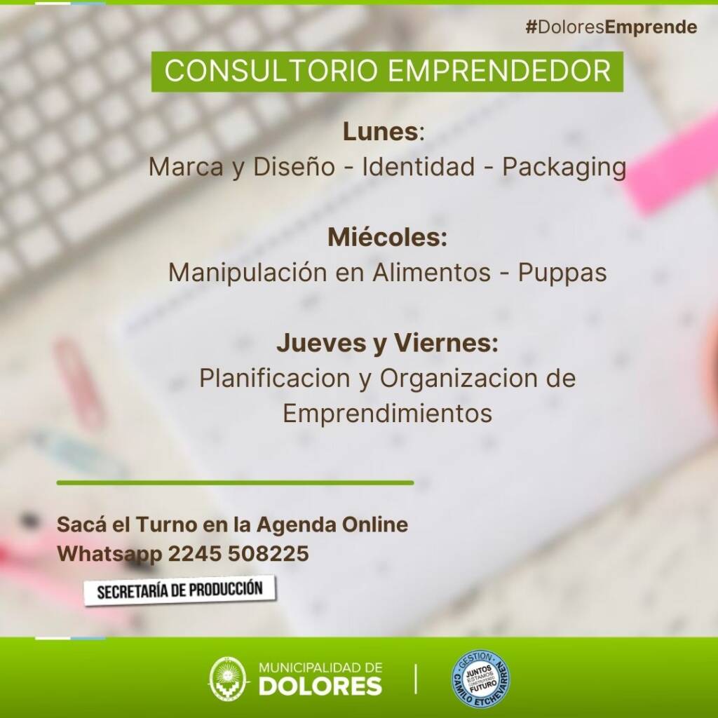 La Municipalidad de Dolores por medio de la Secretaría de Producción pone a disposición el «Consultorio Emprendedor», en el mismo podes sacando un turno online tener mentorías individuales para acompañar el desarrollo de tu emprendimiento enfocado en diferentes áreas: