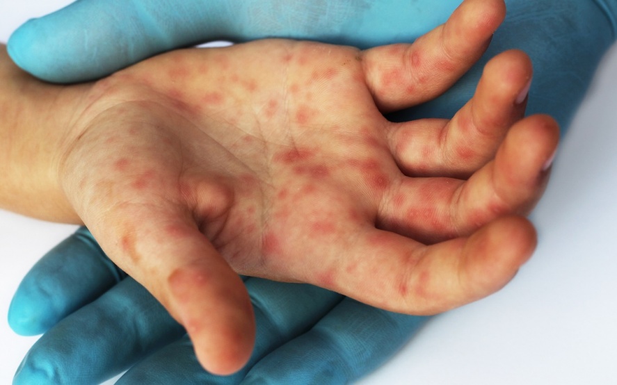 Los síntomas son fiebre alta, erupción en la cara y cuello que se va extendiendo al resto del cuerpo.