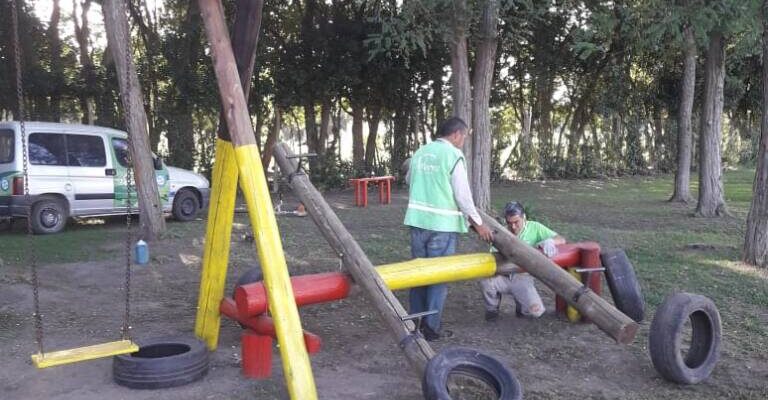 Siguiendo con la creación de nuevos espacios públicos se trabajó en la futura plaza Peñoñori. Personal de la Dirección de Espacios Verdes reacondicionó el sector de juegos, realizó corte de pasto, control de hormigas y armado de canteros.