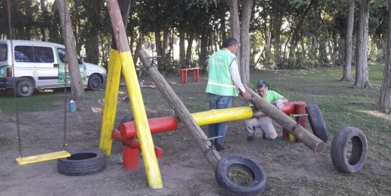 Siguiendo con la creación de nuevos espacios públicos se trabajó en la futura plaza Peñoñori. Personal de la Dirección de Espacios Verdes reacondicionó el sector de juegos, realizó corte de pasto, control de hormigas y armado de canteros.