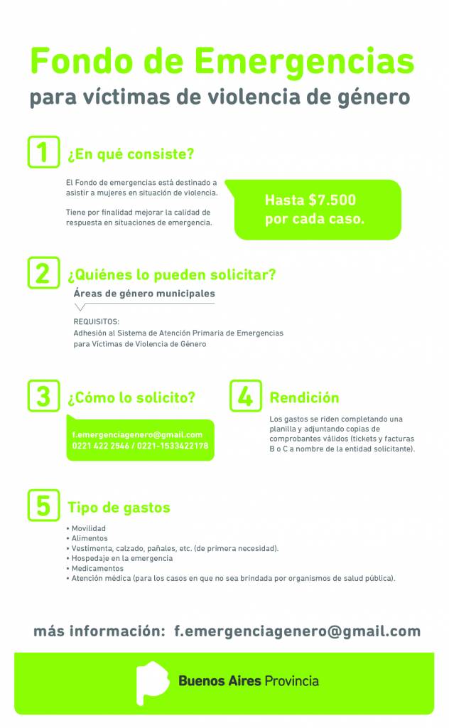 Este fondo se solicitará desde el Área de Género Municipal por mail o teléfono con rendición de cuentas completa. Los tipos de gastos que cubre este Fondo de Emergencia es: movilidad, alimentos, vestimenta, hospedaje en la emergencia, medicamentos y atención médica.